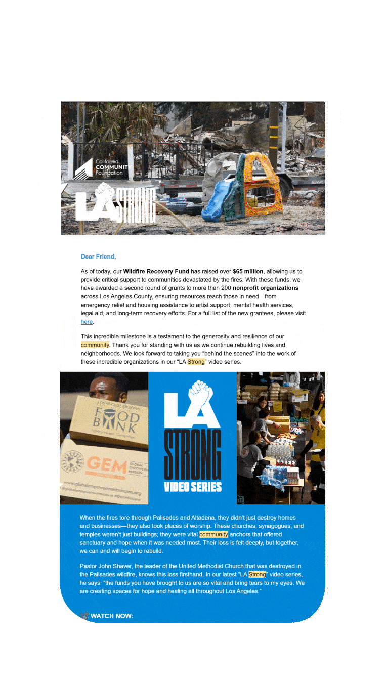 When the January 2025 wildfires broke out across Pacific Palisades and Altadena, the California Community Foundation activated its Wildfire Recovery Fund to mobilize emergency resources across Los Angeles County. Born in June Creative Studio served as creative partner across the full arc of the campaign, from immediate crisis response to sustained recovery storytelling leading digital strategy, content development, social media, email design, and visual asset production.